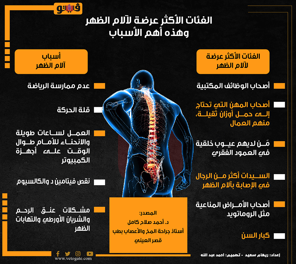 الفئات الأكثر عرضة لآلام الظهر وهذه أهم الأسباب (إنفوجراف) الإثنين 07/أغسطس/2023 - 10:26 ص 8/7/2023 10:26:45 AM أسباب آلام الظهر،فيتو ريهام سعيد شارك طباعة 18 حجم الخط شارك طباعة أسباب آلام الظهر اجهزة الكمبيوتر الأمراض المناعية الشريان الأورطى بطب قصر العيني
