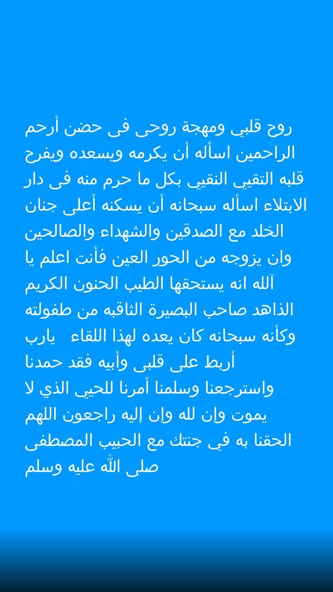 وكتبت الفنانة المعتزلة شمس البارودي: روح قلبي ومهجة روحى فى حضن أرحم الراحمين اسأله أن يكرمه ويسعده ويفرح قلبه التقي النقي بكل ما حرم منه فى دار الابتلاء اسأله سبحانه أن يسكنه أعلى جنان الخلد مع الصدقين والشهداء والصالحين وان يزوجه من الحور العين فأنت أعلم يا الله انه يستحقها الطيب الحنون الكريم الزاهد صاحب البصيرة الثاقبة من طفولته وكأنه سبحانه كان يعده لهذا اللقاء.