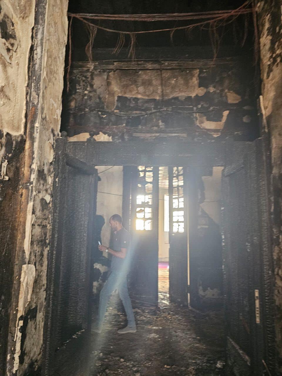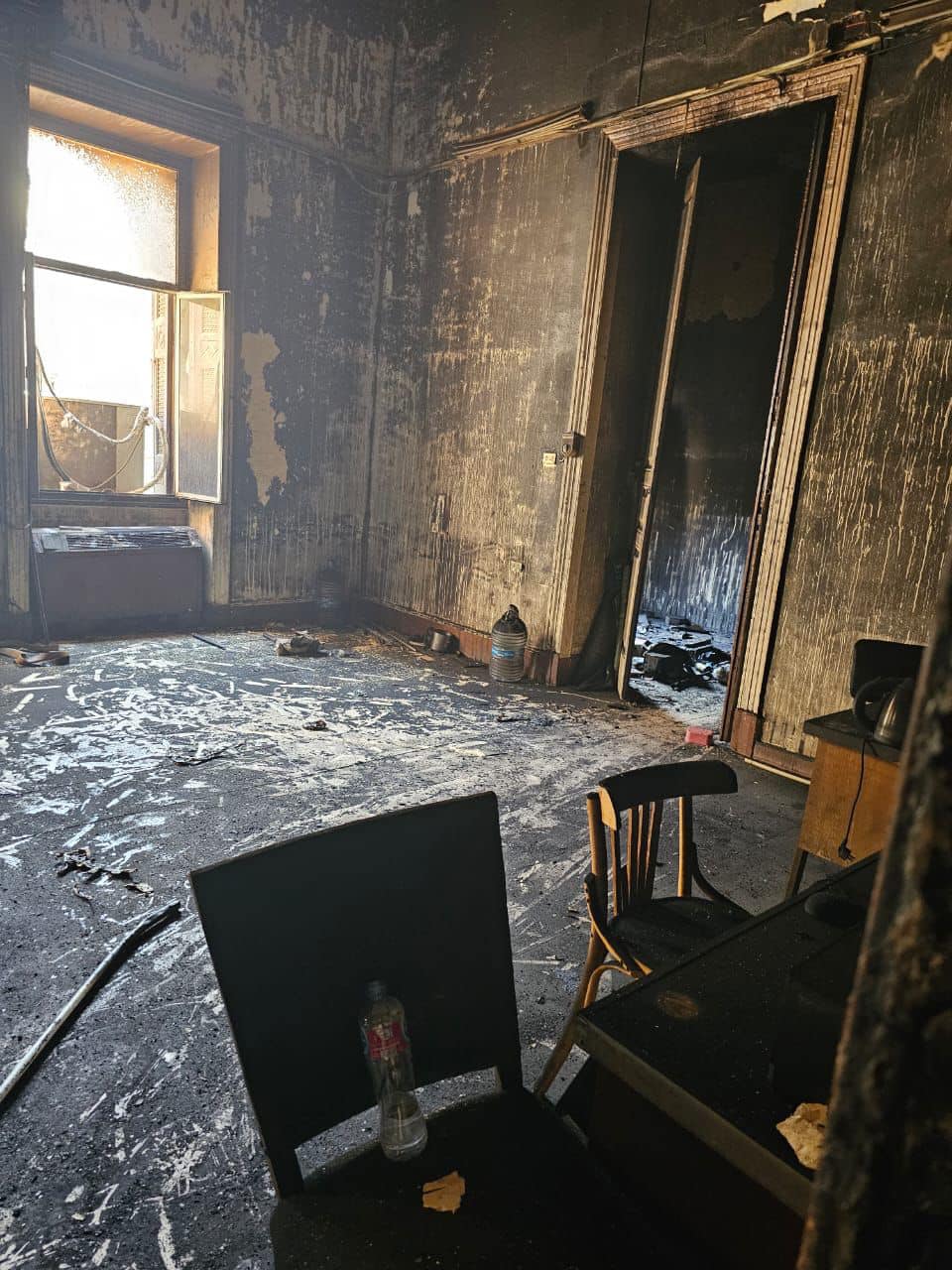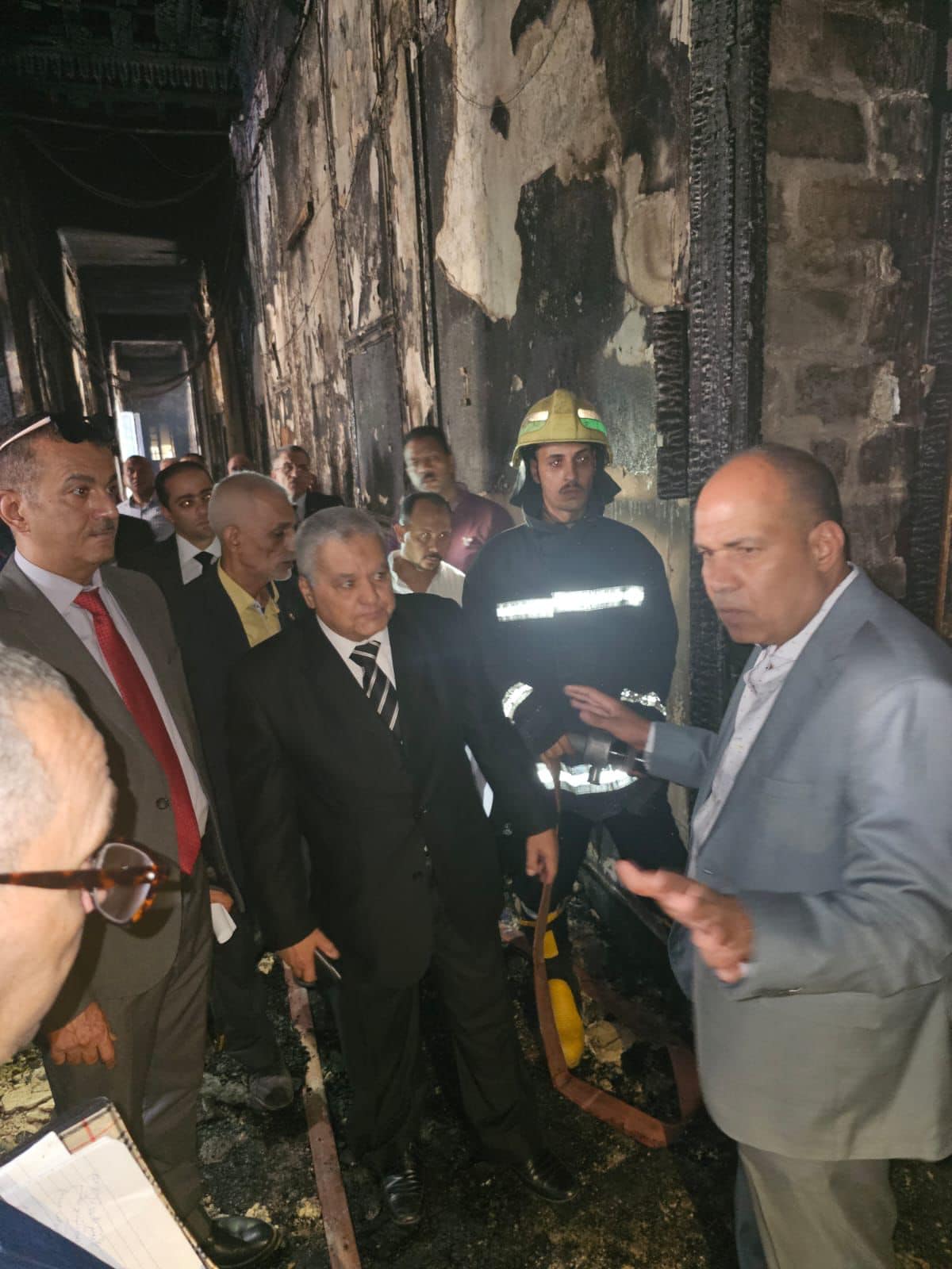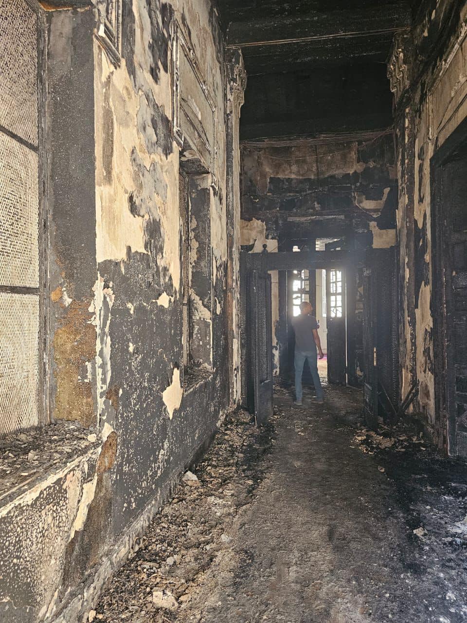 وتبين من المعاينة أنه بحلول الساعة التاسعة والنصف تقريبًا من صباح أمس السبت الموافق ٥ / ٨ / ٢٠٢٣ شبَّ حريق بغرفة الخوادم بالطابق الأول فوق الأرضي صعودًا إلى أعلى المبنى؛ مما أسفر عن الاحتراق الكامل لبعض حجرات الدور الأول فوق الأرضي، والسطح الخاص بالمبنى، مسببًا عددًا من التلفيات الجاري حصرها.