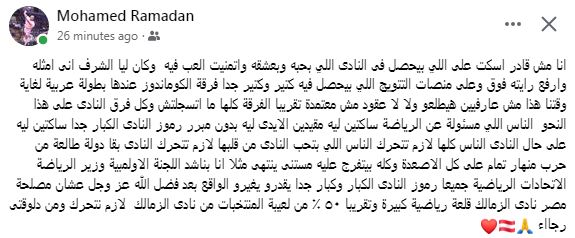 أنا مش قادر أسكت على اللي بيحصل فى النادى اللي بحبه وبعشقه واتمنيت العب فيه وكان ليا الشرف انى امثله وارفع رايته فوق وعلى منصات التتويج.