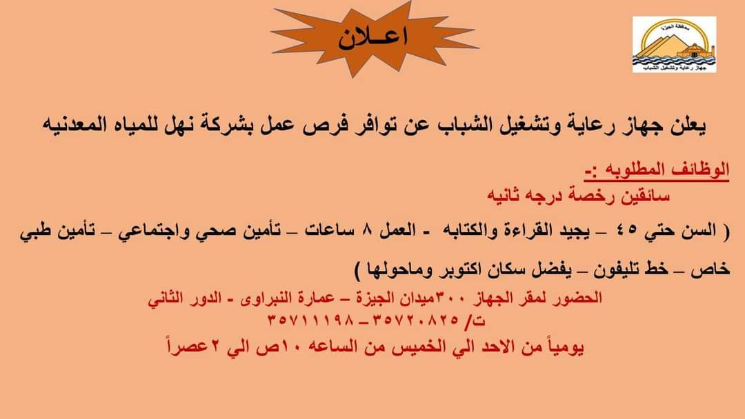 تشغيل الشباب بالجيزة يعلن عن فرص عمل بشركة نهل للمياه المعدنية(مستند)