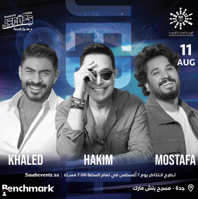 يحيي كل من المطرب حكيم وخالد سليم ومصطفى حجاج، حفلا غنائيا مميزا ضمن حفلات المملكة العربية السعودية، وذلك يوم الجمعة الموافق 11 أغسطس الجاري على مسرح بنش مارك بجدة.