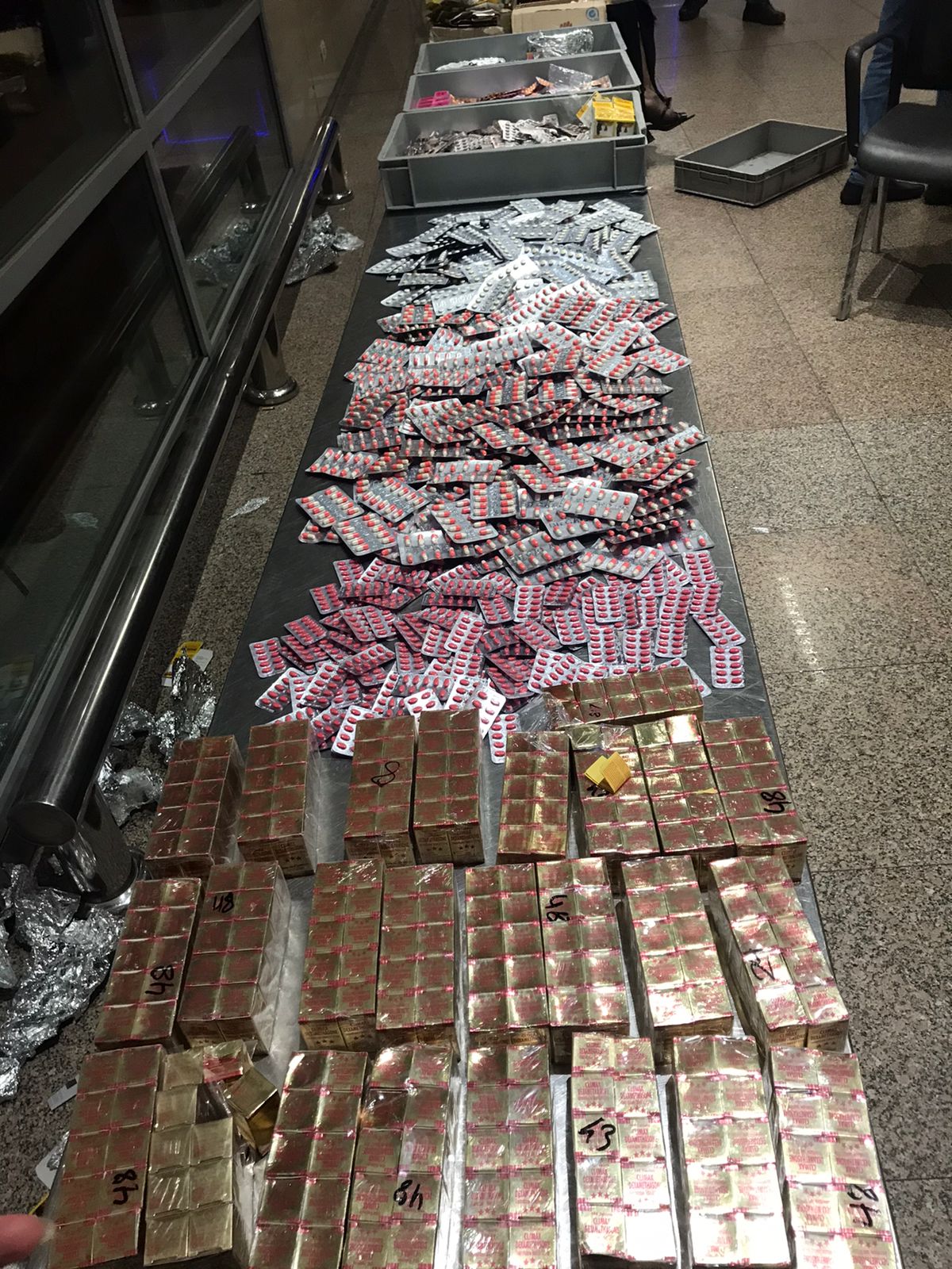 وأضافت المصادر أنه بتفتيش حقائبها علي جهاز الفحص بالأشعة بواسطة كل من آدم عبد العزيز مأمور الجمرك، ومحمد عبد المنعم صالح رئيس القسم، واللذان تلاحظ لهما وجود عبوات دوائية بكثرة داخل حقائب الراكبة، قام ريمون غطاس مدير الحركة المشرف على صالة الوصول بمبني الركاب رقم ٣، بتكليف مصطفى بحر مأمور الجمرك، بتفتيش حقائب الراكبة يدويا مما اسفر عن وجود كميات كبيرة من الأدوية سالفة الذكر.