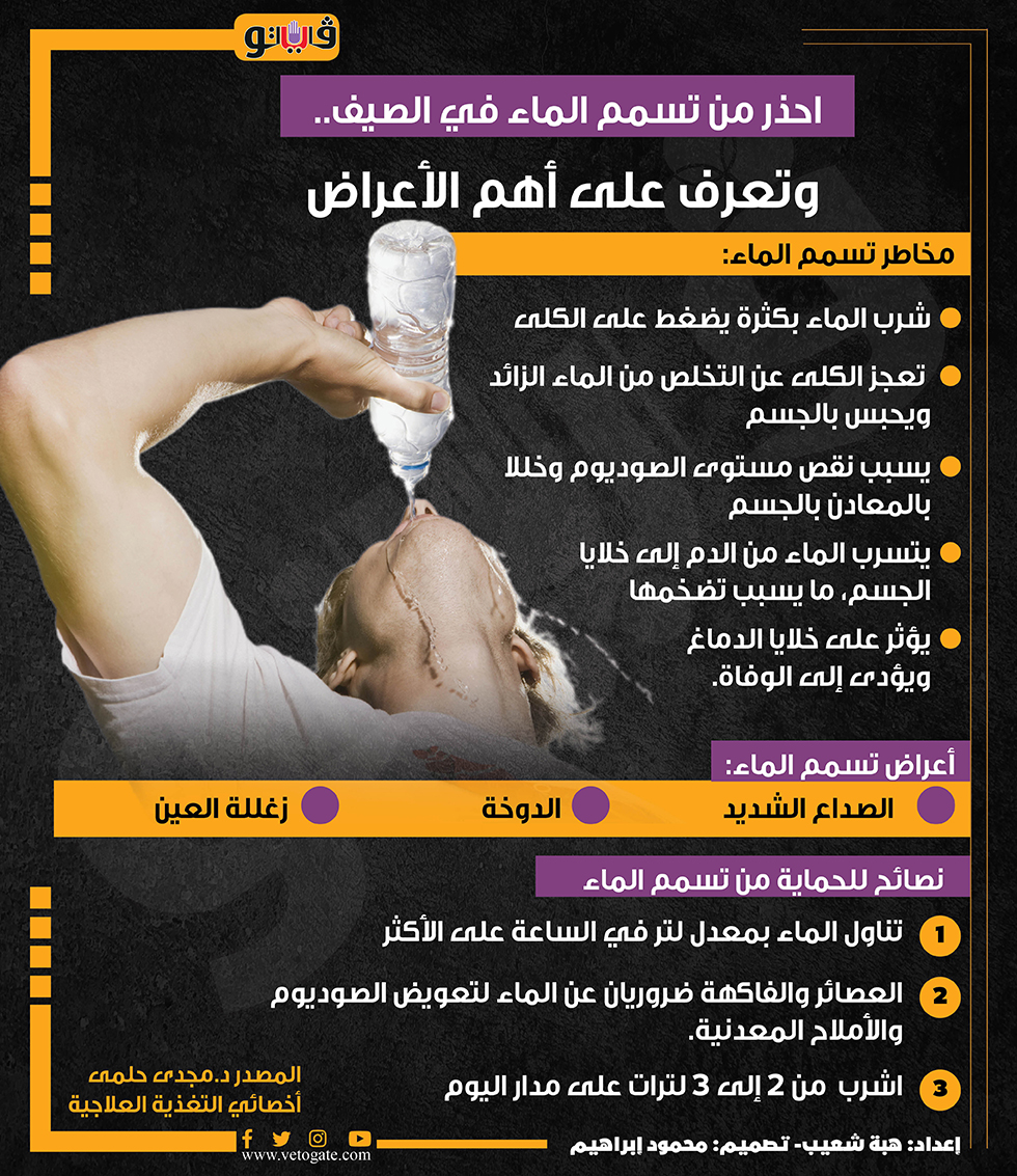 احذر من تسمم الماء في الصيف.. وتعرف على أهم الأعراض (إنفوجراف) الثلاثاء 08/أغسطس/2023 - 05:52 م 8/8/2023 5:52:52 PM تسمم الماء، فيتو هبة شعيب شارك طباعة 18 حجم الخط شارك طباعة التغذية العلاجية أعراض تسمم الماء اخصائي التغذية العلاجية خلايا الدماغ تسمم الماء
