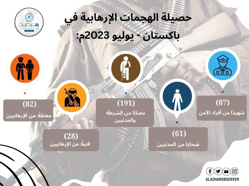 أوضح مرصد الأزهر لمكافحة التطرف أن باكستان شهدت خلال شهر يوليو (2023) ارتفاعًا في عدد ضحايا العمليات الإرهابية مقارنة بالشهر الماضي، حيث بلغ عدد العمليات ما يقرب من (24) عملية استهدف خلالها مسلحي"طالبان باكستان"، و"الانفصاليون البلوتش" و"داعش خراسان" مناطق مختلفة في البلاد.