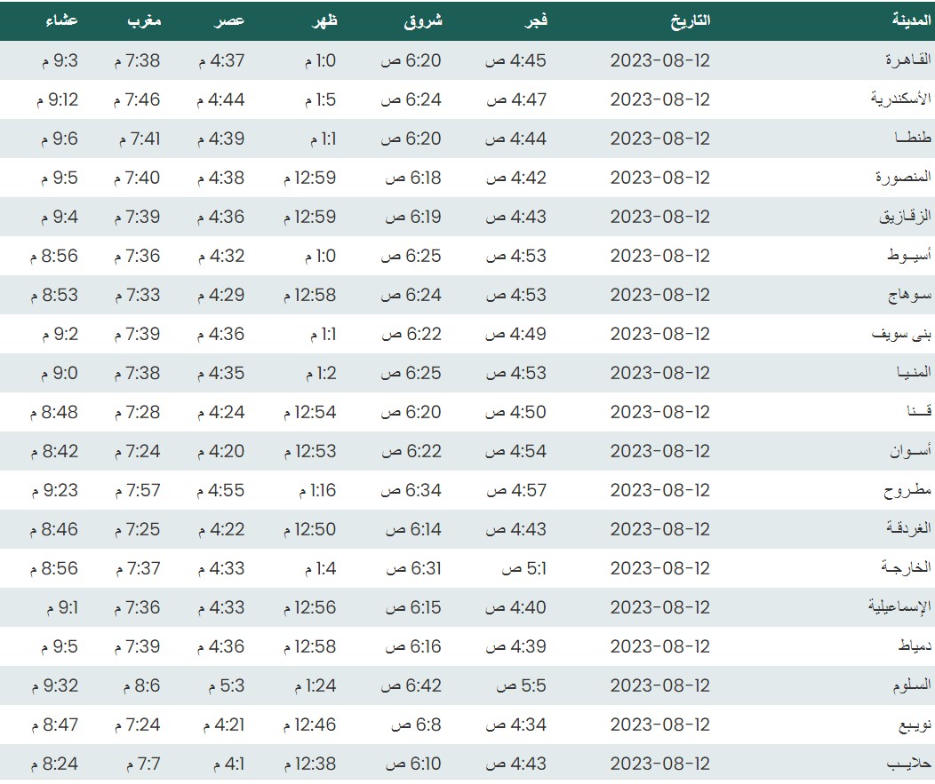 مواقيت الصلاة اليوم وفقًا للتوقيت المحلي لمدينتي القاهرة والإسكندرية وعدد من مدن ومحافظات الجمهورية من واقع بيانات الهيئة العامة للمساحة