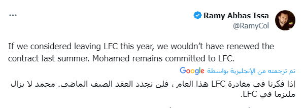 وكتب رامي عباس اليوم الإثنين عبر حسابه على "تويتر": "إذا كنا نفكر في مغادرة ليفربول هذا العام، فلم نكن لنجدد العقد في الصيف الماضي".