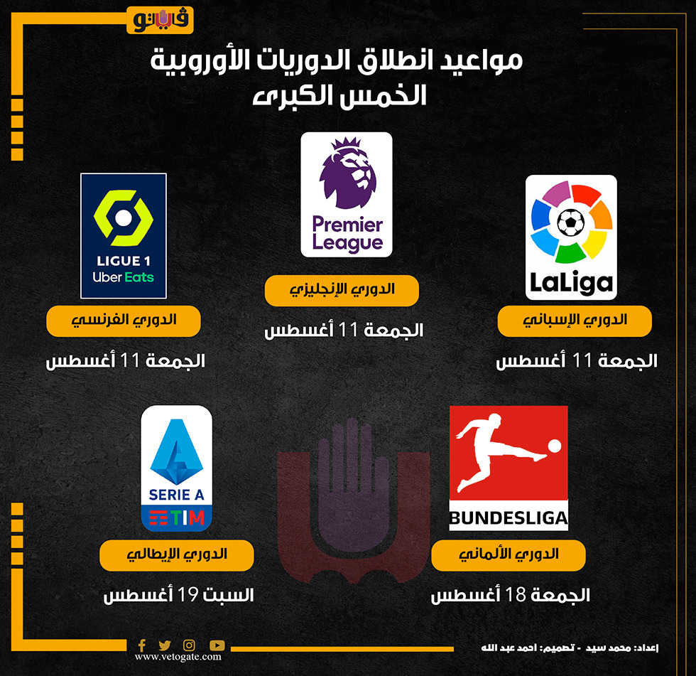 مواعيد انطلاق الدوريات الأوروبية الخمس الكبرى (إنفوجراف) الأربعاء 09/أغسطس/2023 - 12:08 م 8/9/2023 12:08:13 PM الدوريات الخميس الكبرى في أوروبا، فيتو محمد سيد شارك طباعة 18 حجم الخط شارك طباعة الدوري الانجليزي الدوري الإيطالي الدوري الإسباني الدوري الفرنسي الدوري الألماني