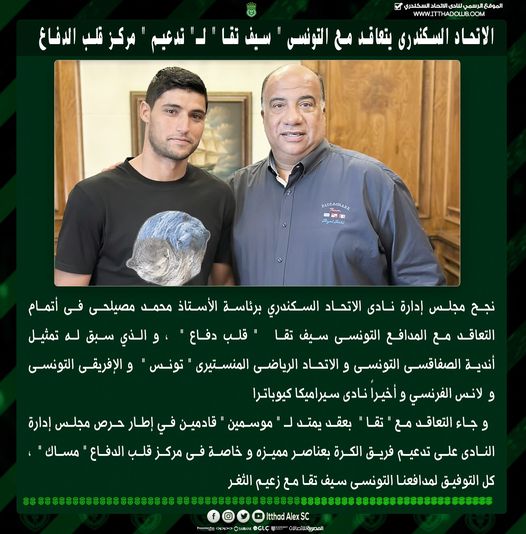 نجح مجلس إدارة نادي الاتحاد السكندري برئاسة محمد مصيلحي، في إتمام التعاقد مع المدافع التونسي سيف تقا، والذي سبق له تمثيل أندية الصفاقسي التونسي والاتحاد الرياضي المنستيري التونسي والإفريقى التونسي ولانس الفرنسي وأخيرًا نادى سيراميكا كليوباترا.