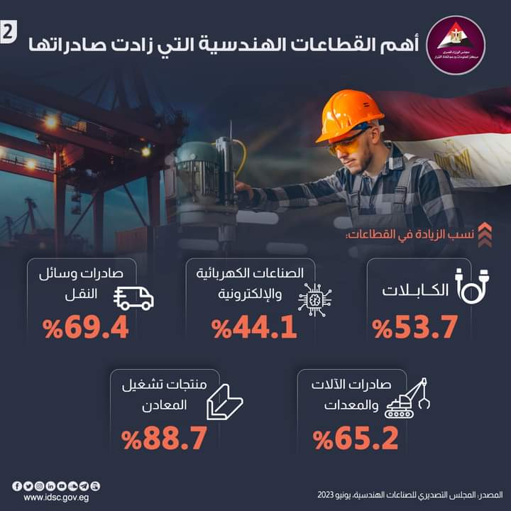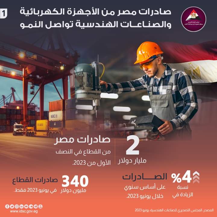 نشر مركز المعلومات ودعم اتخاذ القرار بمجلس الوزراء عبر صفحته الرسمية على موقع التواصل الاجتماعي فيسبوك إنفوجراف بشأن ارتفاع صادرات مصر من الأجهزة الكهربائية والصناعات الهندسية.