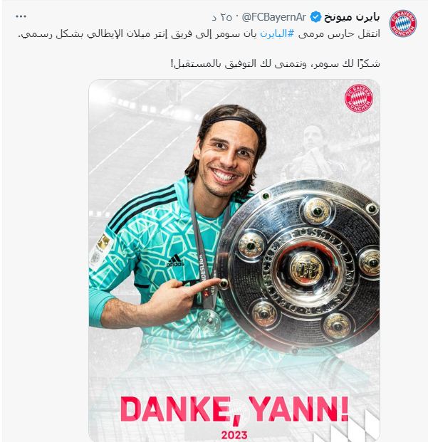 أعلن نادي بايرن ميونخ الألماني، مساء اليوم الإثنين، بشكل رسمي، عن انتقال حارسه الدولي السويسري يان سومر إلى فريق إنتر ميلان الإيطالي.