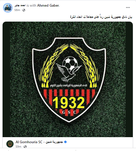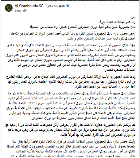 دوري المحترفين، أصدر نادي جمهورية شبين بيانا رسميا قبل قليل عبر حسابه الرسمي على موقع التواصل الإجتماعي فيسبوك، ردا على القرارات التي تم تسريبها من اجتماع مجلس إدارة اتحاد الكرة الذي انعقد اليوم بمقر الاتحاد بالجزيرة، بحضور عدد من أندية الجمعية العمومية للاتحاد