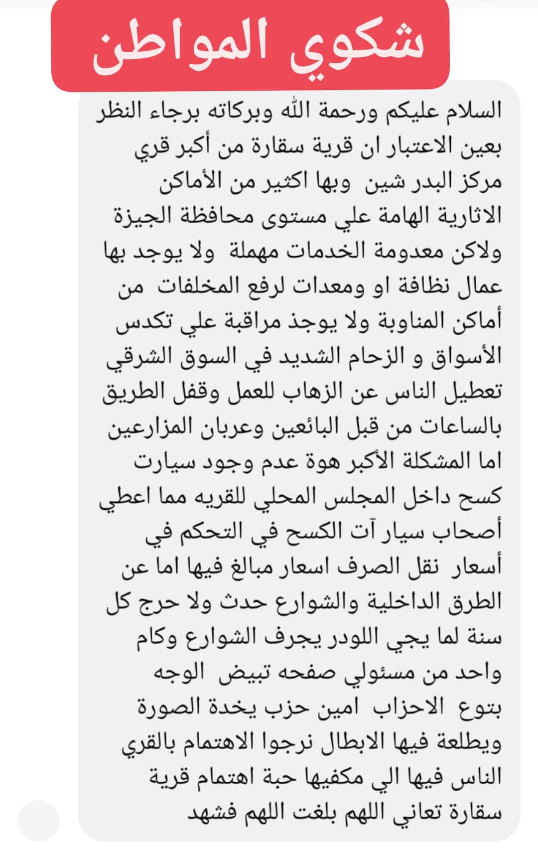 كلف اللواء أحمد راشد محافظ الجيزة رئيس مركز ومدينة البدرشين بالاستجابة لشكاوي المواطنين الواردة بشأن إزالة التعديات علي الطريق العام بشارع السويقه بقرية سقارة