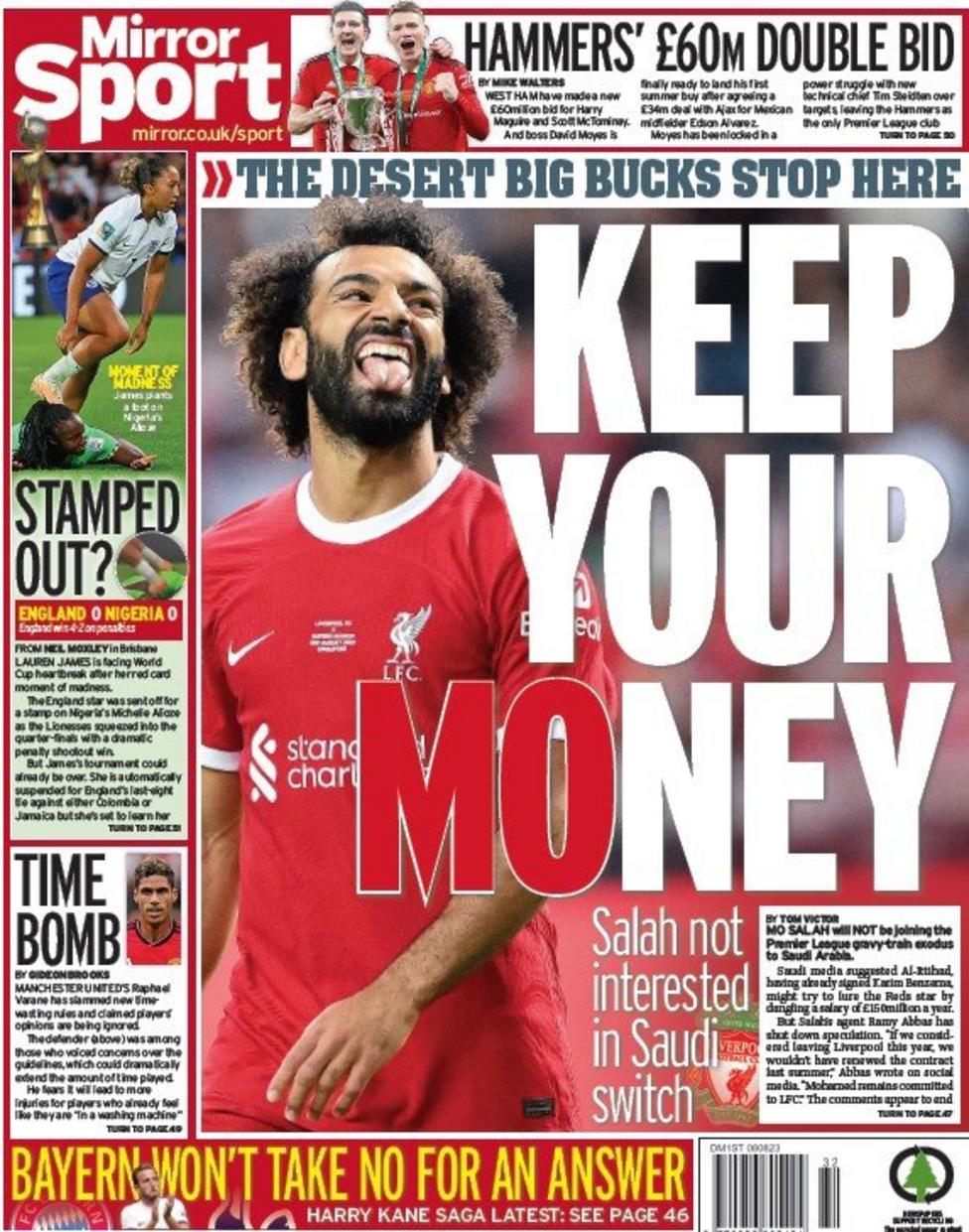 صحيفة "ميرور" عنونت: "احتفظ بأموالك.. صلاح غير مهتم بالانتقال للسعودية".