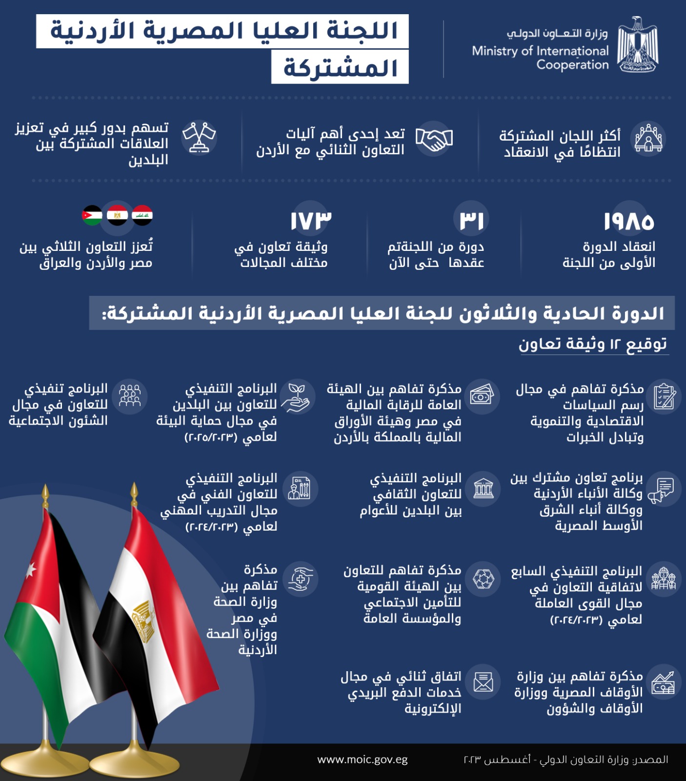 وانعقدت الدورة الحادية والثلاثين من اللجنة المصرية الأردنية التي تعد أكثر اللجان المشتركة انتظامًا منذ بدء انعقادها عام 1985، في توقيت استثنائي على مستوى التحديات الإقليمية والعالمية، بما يعزز أهميتها لفتح مزيد من مجالات التعاون الثنائين بين البلدين الشقيقين، تأكيدًا على أهمية العمل العربي المشترك والشراكات الإقليمية لتحقيق التنمية المستدامة والشاملة، وكذا تحفيز التعاون الثلاثي بين مصر والأردن والعراق.