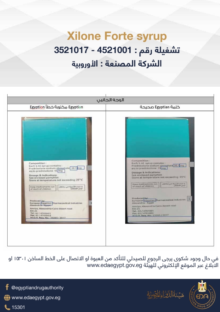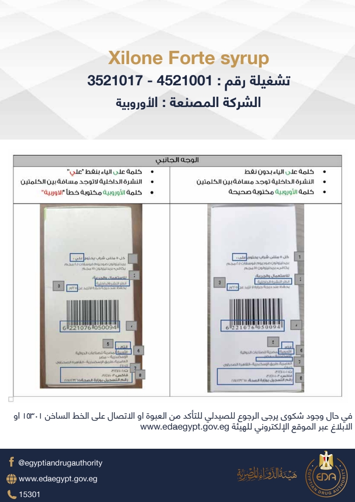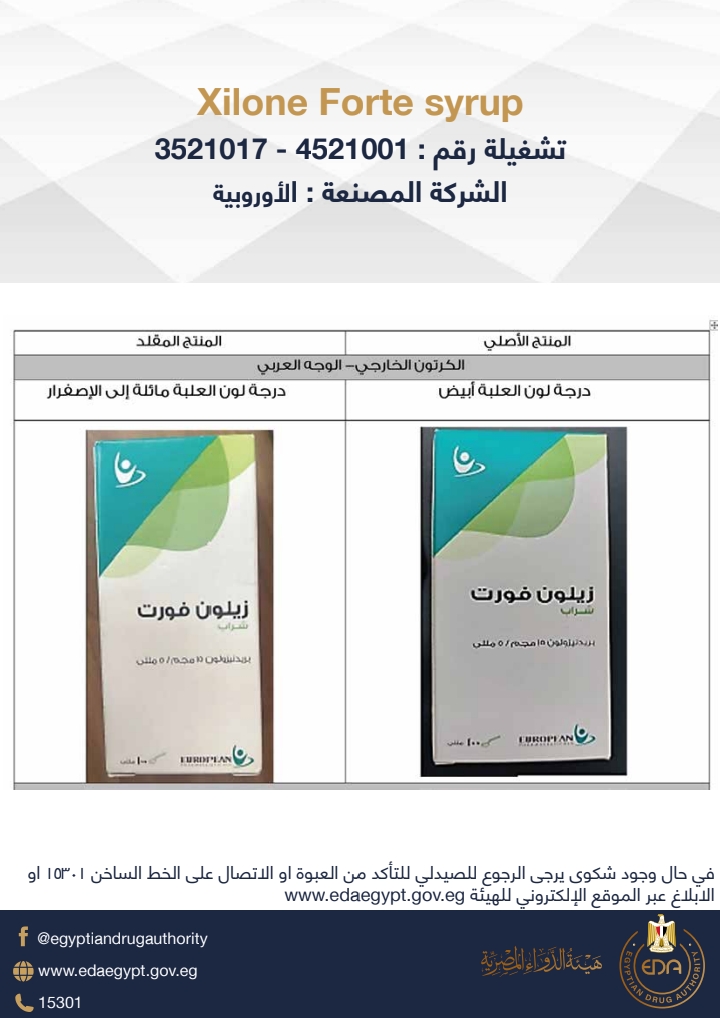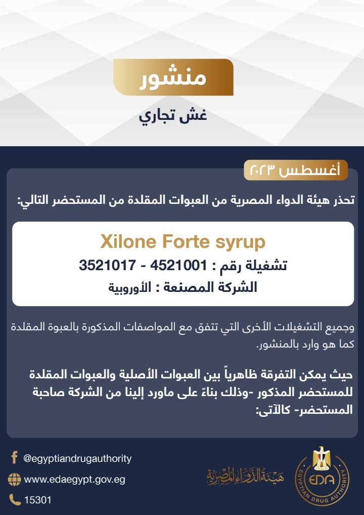 وقالت هيئة الدواء المصرية في منشور تحذيري لها إن الغش التجاري من مستحضر syrup Forte XiIone تشغيلة رقم: 4521001 - 3521017