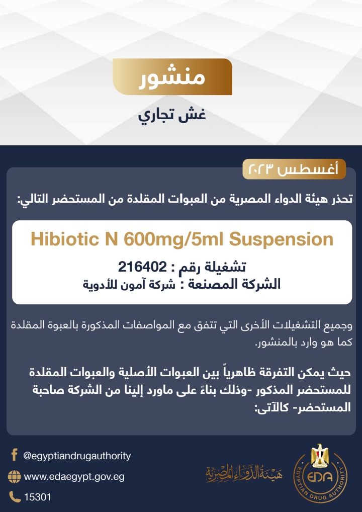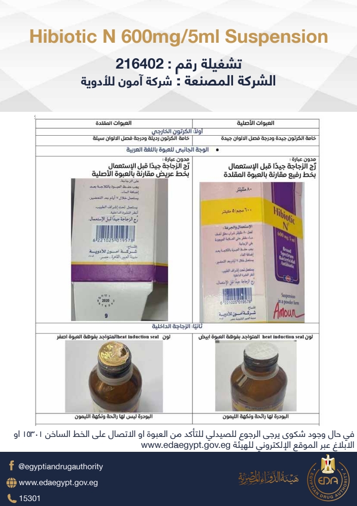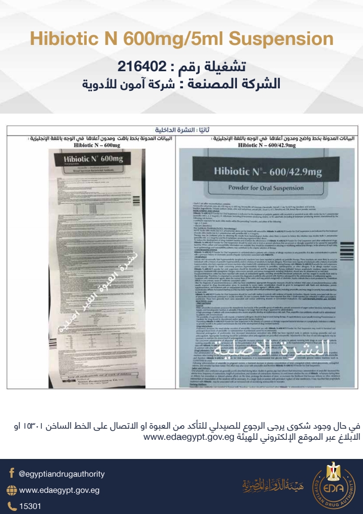 Suspension 5mI/6OOmg N Hibiotic تشغيلة رقم: 216402.