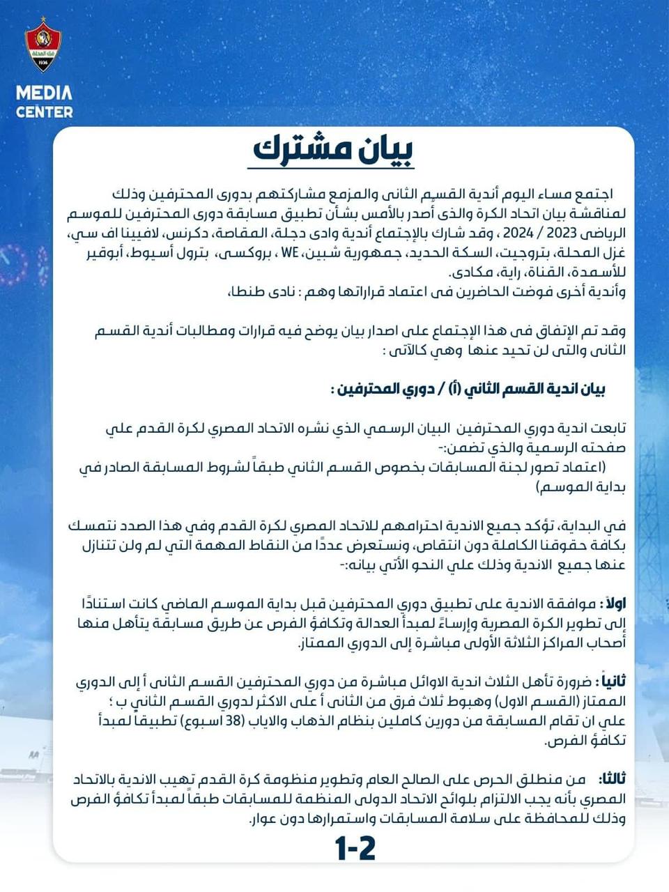 وفي البداية، تؤكد جميع الأندية احترامهم للاتحاد المصري لكرة القدم وفي هذا الصدد نتمسك بكافة حقوقنا الكاملة دون انتقاص، ونستعرض عددًا من النقاط المهمة التي لم ولن تتنازل عنها جميع الأندية وذلك علي النحو الآتي بيانه:-