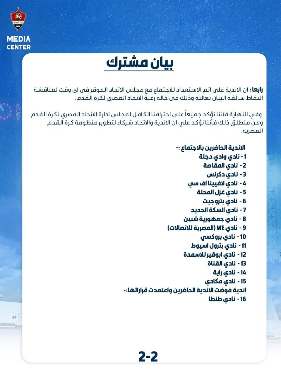 وفي النهاية فأننا نؤكد جميعًا على احترامنا الكامل لمجلس إدارة الاتحاد المصري لكرة القدم ومن منطلق ذلك فإننا نؤكد أن الأندية والاتحاد شركاء لتطوير منظومة كرة القدم المصرية.