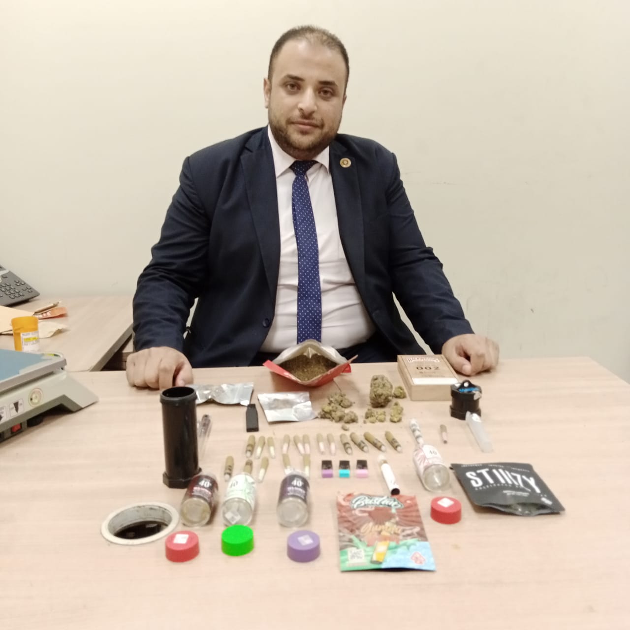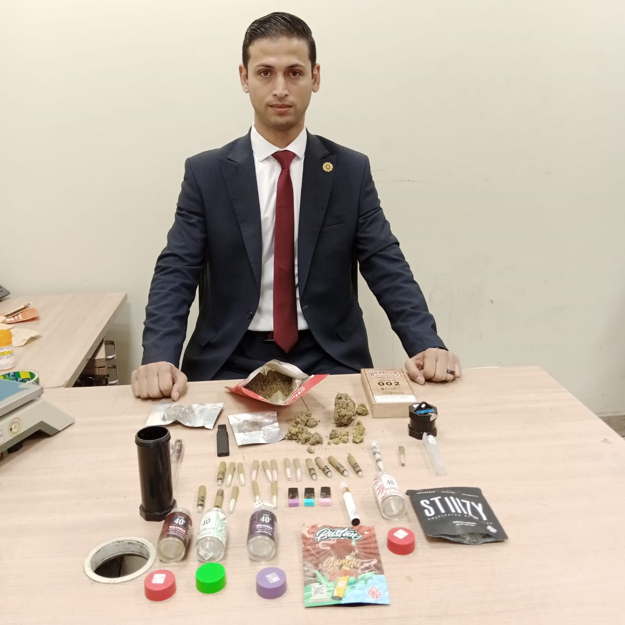 وبتفتيش حقائبة على جهاز الفحص بالأشعة بواسطة كل من محمد جمال الدين مأمور الجمرك وأحمد الشريف رئيس القسم واللذان تلاحظ لهما وجود كثافات عضوية داخل حقائب الراكب، قام أحمد فتحي عبد المجيد مدير الحركة المشرف على صالة الوصول بمبني الركاب رقم ٢ بتكليف وليد جمال ومحمد عبد المحسن مأمورا الجمرك بتفتيش حقائب الراكب يدويا مما اسفر عن ضبط كمية متنوعة من المخدرات عبارة عن ٤ أكياس بداخلهم نبات الماريجوانا المخدر بوزن إجمالي ٤٩ جراما و٤ برطمانا زجاجيا بداخلهم ١٧ سيجارة بهم عشب الماريجوانا المخدر وعبوة بلاستيكية بداخلها عشب نبات الماريجوانا بوزن ٧٩ جراما و٢ سيجارة الكترونية بهم زيت الماريجوانا و٣ تانكات بهم نفس الزيت المخدر وأنبوب شفاف بداخله سيجارة بها عشب نفس المخدر.