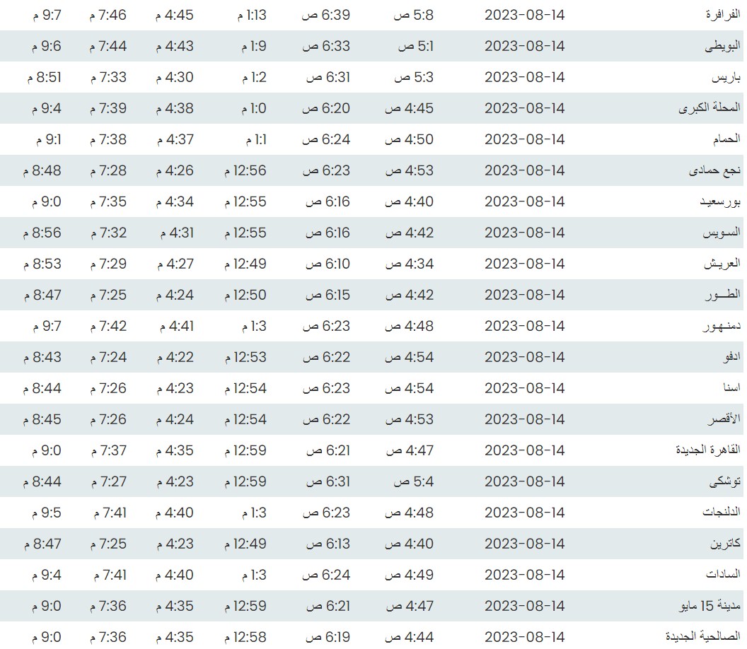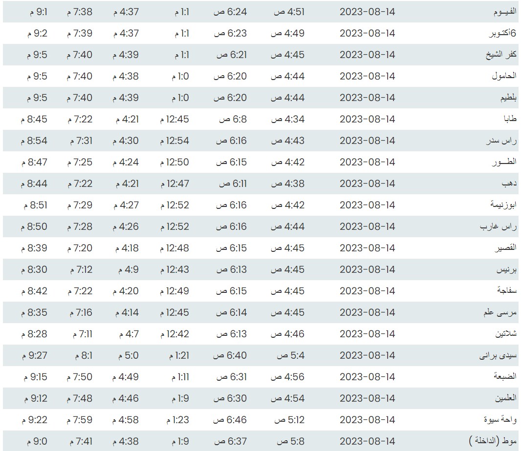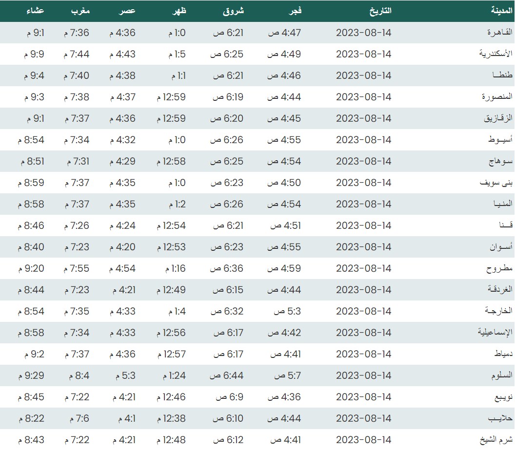 مواقيت الصلاة اليوم وفقًا للتوقيت المحلي لمدينتي القاهرة والإسكندرية وكذلك،مواقيت الصلاة، لعدد من مدن ومحافظات الجمهورية من واقع بيانات الهيئة العامة للمساحة