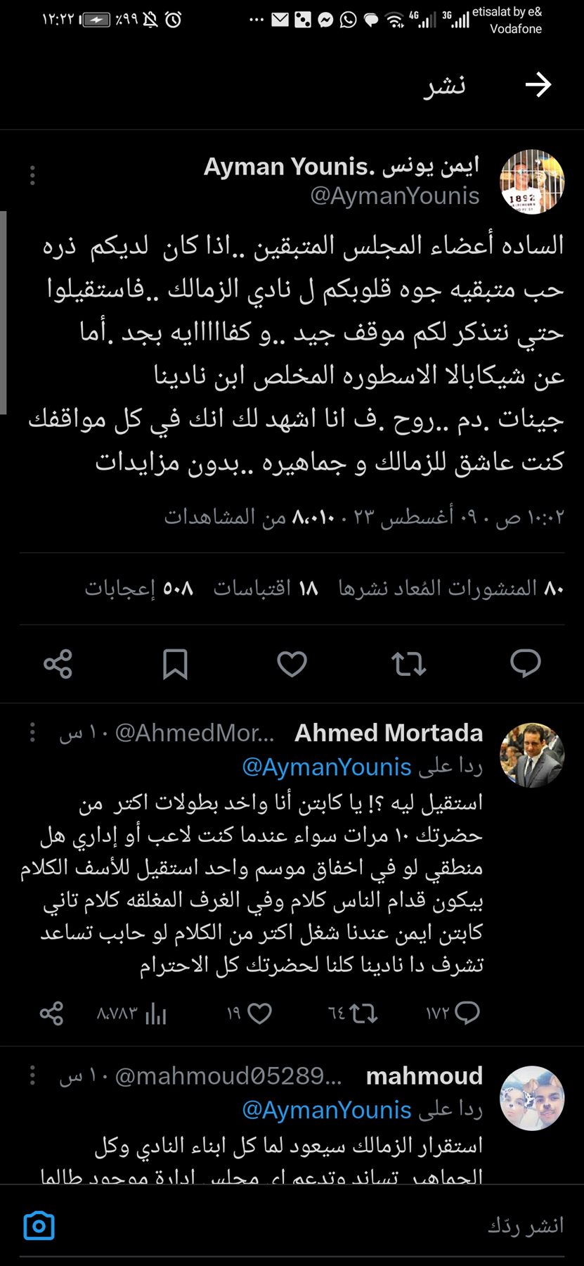 وكتب أيمن يونس عبر صفحته الرسمية على تويتر:" السادة أعضاء المجلس المتبقين إذا كان لديكم ذرة حب متبقية جوه قلوبكم لنادي الزمالك..فاستقيلوا حتى نتذكر لكم موقف جيد وكفاية بجد".