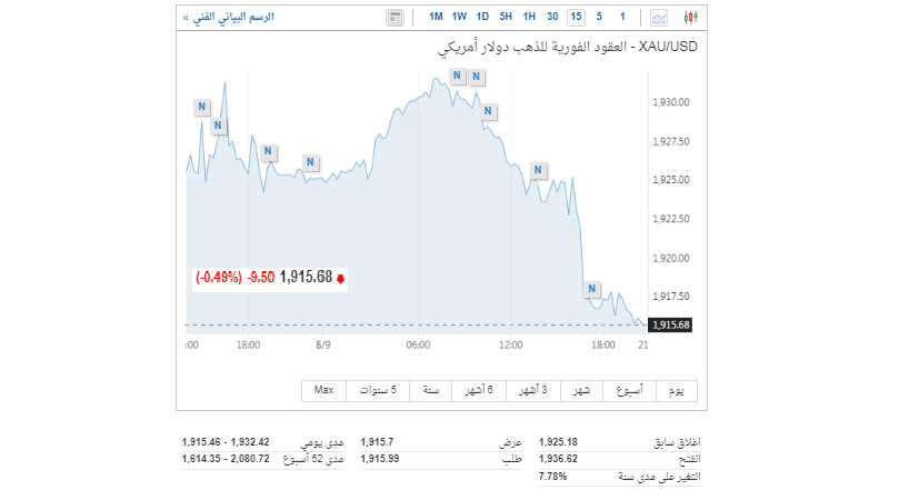 انخفاض حاد لمؤشر الذهب العالمي، أسعار الذهب مباشر 9/ 8/ 2023