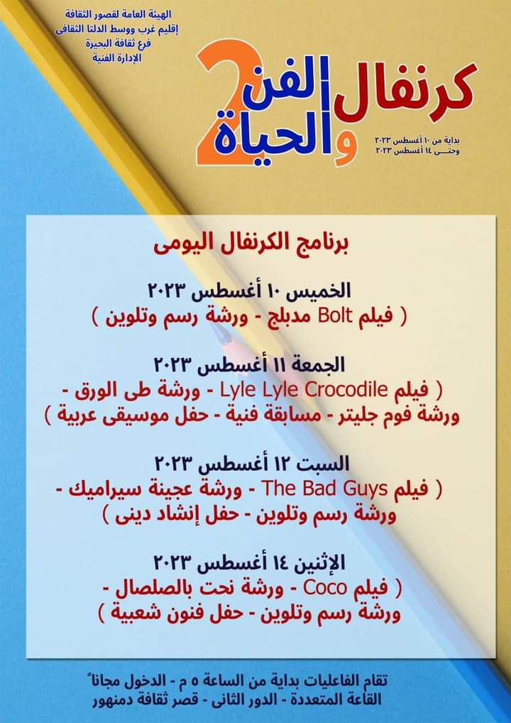 ينظم قصر ثقافة دمنهور بمحافظة البحيرة "كرنفال الفن والحياة" ضمن مبادرة "ثقافتنا في إجازتنا" وذلك بدءا من اليوم الخميس الموافق 10 أغسطس وحتى الإثنين 14 أغسطس، وتقام الفعاليات فى تمام الساعة 5 مساءً والدخول مجانا والحجز بأسبقية الحضور.