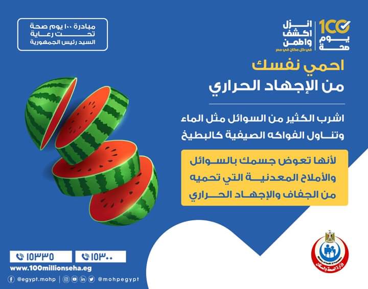 كما نصحت وزارة الصحة بضرورة شرب الكثير من السوائل مثل الماء موضحة أن شرب الماء وتناول الفواكه يعوض الجسم بالسوائل والأملاح المعدنية التي تحميه من الجفاف والإجهاد الحراري.