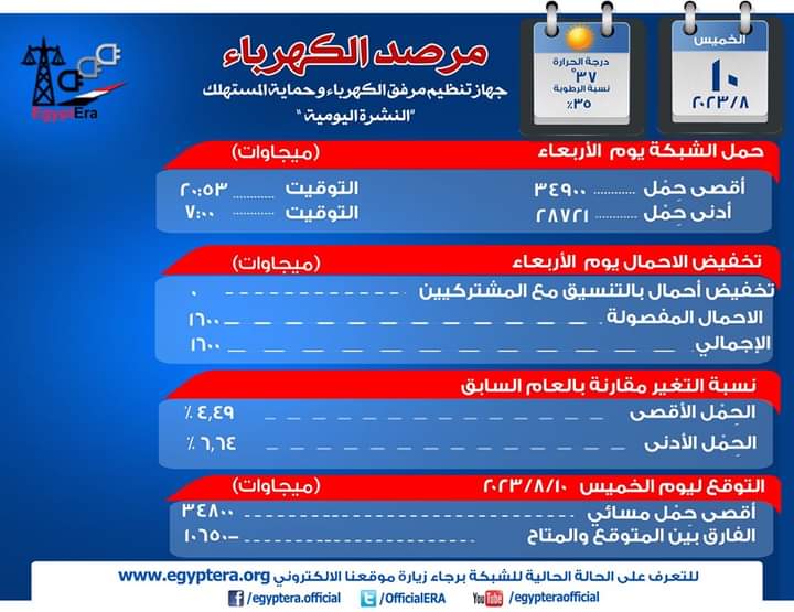 وقال جهاز تنظيم الكهرباء وحماية المستهلك أن أقصى الأحمال الكهربائية على الشبكة الموحدة للكهرباء اليوم الخميس تم تسجيله 34 ألفا و800 ميجاوات، بانخفاض 400 ميجاوات عن الأحمال الكهربائية التي سجلتها الشبكة أول أمس الثلاثاء والتي وصلت إلى 35 الفا و200 ميجاوات.