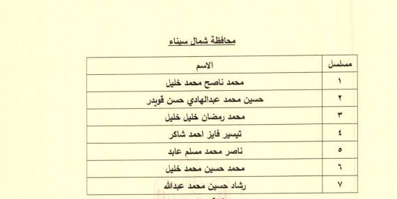 وضمت قائمة المعينين في مجلس إدارة الغرفة التجارية لمحافظة شمال سيناء، محمد ناصح محمد خليل، حسین محمد عبدالهادي حسن قويدر، محمد رمضان خليل خليل، تيسير فايز احمد شاكر، ناصر محمد مسلم عابد، محمد حسين محمد خليل، رشاد حسین محمد عبدالله.