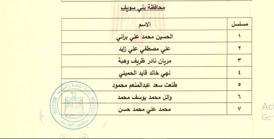 وضمت قائمة أعضاء مجلس إدارة الغرفة التجارية بمحافظة بني سويف المعينين، كلًا من، الحسين محمد علي براني، علي مصطفي علي زايد، مريان نادر ظريف وهبة، نهي خالد قايد الحميلي، طلعت سعد عبد المنعم محمود، وائل محمد يوسف محمد، محمد علي محمد حسن.