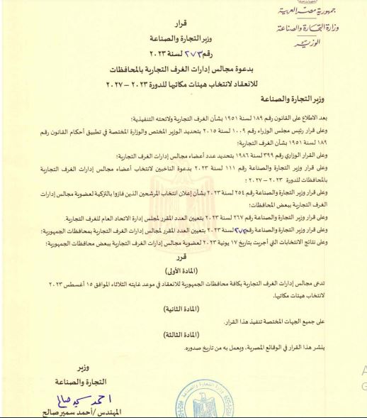 وكان المهندس احمد سمير وزير الصناعة، أصدر قرارًا بتعيين الأسماء الواردة أعضاء بمجلس إدارة الاتحاد العام للغرف التجارية حتى نهاية الدورة الانتخابية (۲۰۲۳ -۲۰۲۷):