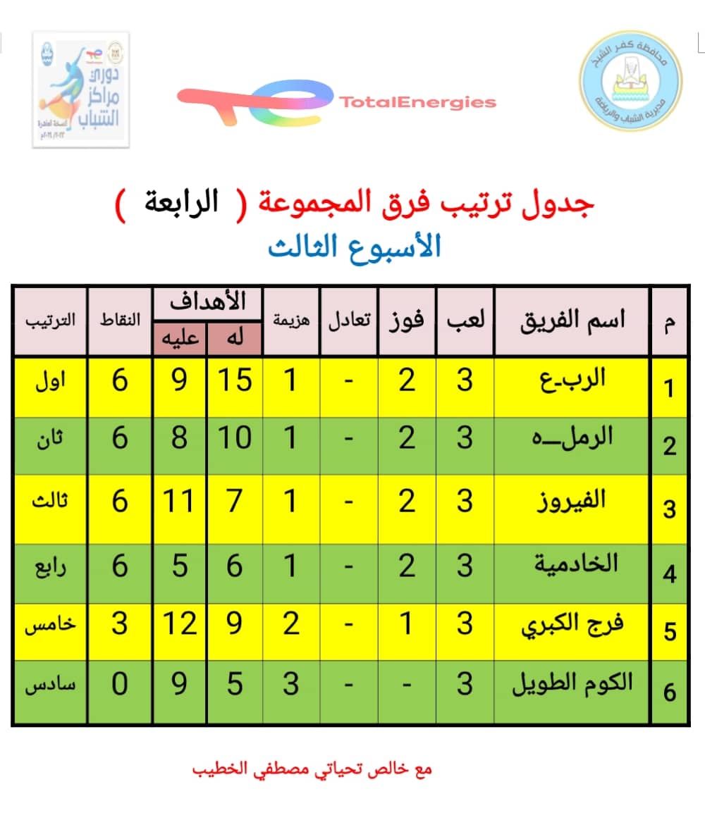 أوضح الدكتور عزت محروس وكيل وزارة الشباب والرياضة بكفر الشيخ، أن فريق محلة دياى تصدر المجموعة الأولى بسبعة نقاط، وشباس الشهداء تصدر المجموعة الثانية بتسعة نقاط، وفريق روينة بتسعة نقاط تصدر المجموعة الثالثة، أما عن المجموعة الرابعة كانت الصدارة لفريق الربع بستة نقاط.