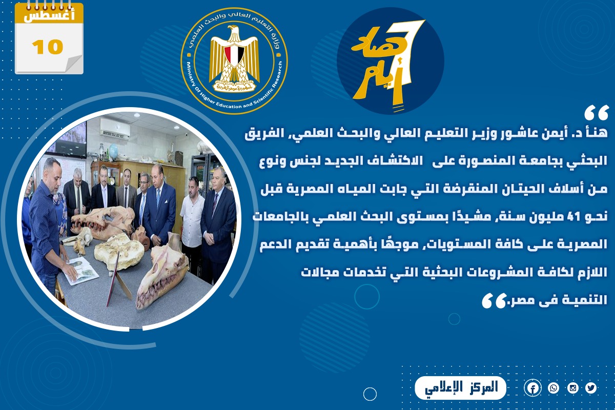 7) هنأ د. أيمن عاشور وزير التعليم العالي والبحث العلمي، الفريق البحثي بجامعة المنصورة على الاكتشاف الجديد لجنس ونوع من أسلاف الحيتان المنقرضة التي جابت المياه المصرية قبل نحو 41 مليون سنة، مشيدًا بمستوى البحث العلمي بالجامعات المصرية على كافة المستويات، موجهًا بأهمية تقديم الدعم اللازم لكافة المشروعات البحثية التي تخدمات مجالات التنمية في مصر.