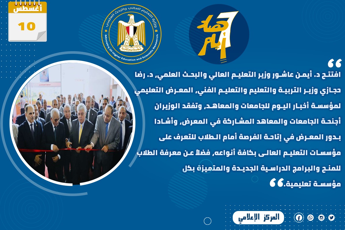 6) افتتح د. أيمن عاشور وزير التعليم العالي والبحث العلمي، د. رضا حجازي وزير التربية والتعليم والتعليم الفني، المعرض التعليمي لمؤسسة أخبار اليوم للجامعات والمعاهد، وتفقد الوزيران أجنحة الجامعات والمعاهد المشاركة في المعرض، وأشادا بدور المعرض في إتاحة الفرصة أمام الطلاب للتعرف على مؤسسات التعليم العالي بكافة أنواعه، فضلًا عن معرفة الطلاب للمنح والبرامج الدراسية الجديدة والمتميزة بكل مؤسسة تعليمية.