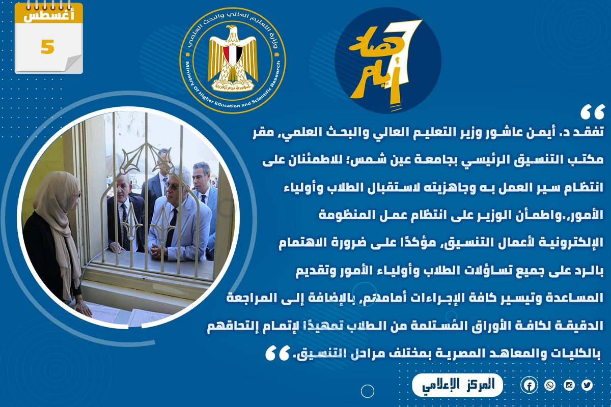 1) تفقد د. أيمن عاشور وزير التعليم العالي والبحث العلمي، مقر مكتب التنسيق الرئيسي بجامعة عين شمس؛ للاطمئنان على انتظام سير العمل به وجاهزيته لاستقبال الطلاب وأولياء الأمور،.واطمأن الوزير على انتظام عمل المنظومة الإلكترونية لأعمال التنسيق، مؤكدًا على ضرورة الاهتمام بالرد على جميع تساؤلات الطلاب وأولياء الأمور وتقديم المساعدة وتيسير كافة الإجراءات أمامهم، بالإضافة إلى المراجعة الدقيقة لكافة الأوراق المُستلمة من الطلاب تمهيدًا لإتمام التحاقهم بالكليات والمعاهد المصرية بمختلف مراحل التنسيق.