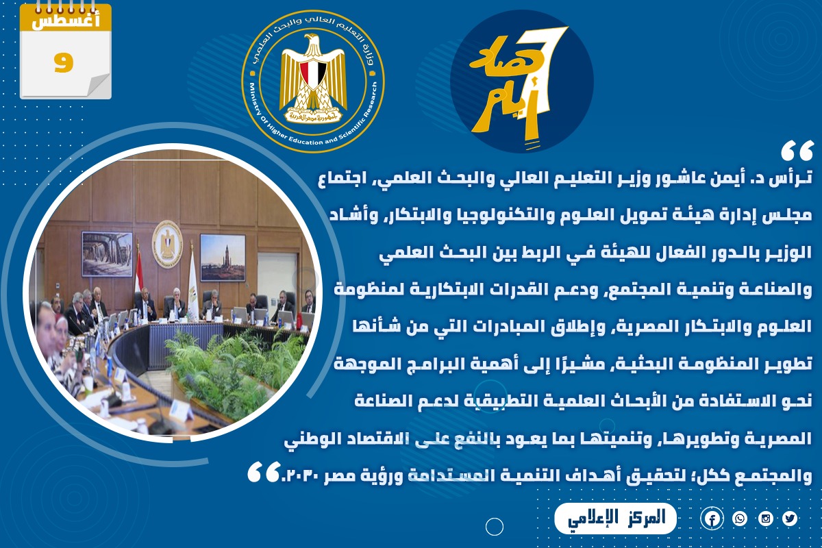 5) ترأس د. أيمن عاشور وزير التعليم العالي والبحث العلمي، اجتماع مجلس إدارة هيئة تمويل العلوم والتكنولوجيا والابتكار، وأشاد الوزير بالدور الفعال للهيئة في الربط بين البحث العلمي والصناعة وتنمية المجتمع، ودعم القدرات الابتكارية لمنظومة العلوم والابتكار المصرية، وإطلاق المبادرات التي من شأنها تطوير المنظومة البحثية، مشيرًا إلى أهمية البرامج الموجهة نحو الاستفادة من الأبحاث العلمية التطبيقية لدعم الصناعة المصرية وتطويرها، وتنميتها بما يعود بالنفع على الاقتصاد الوطني والمجتمع ككل؛ لتحقيق أهداف التنمية المستدامة ورؤية مصر ٢٠٣٠.
