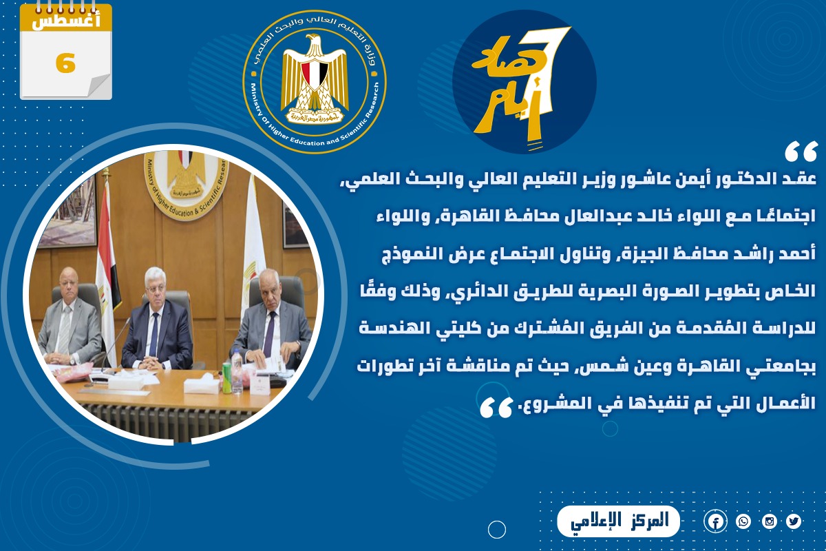 2) عقد الدكتور أيمن عاشور وزير التعليم العالي والبحث العلمي، اجتماعًا مع اللواء خالد عبدالعال محافظ القاهرة، واللواء أحمد راشد محافظ الجيزة، وتناول الاجتماع عرض النموذج الخاص بتطوير الصورة البصرية للطريق الدائري، وذلك وفقًا للدراسة المُقدمة من الفريق المُشترك من كليتي الهندسة بجامعتي القاهرة وعين شمس، حيث تم مناقشة آخر تطورات الأعمال التي تم تنفيذها في المشروع.