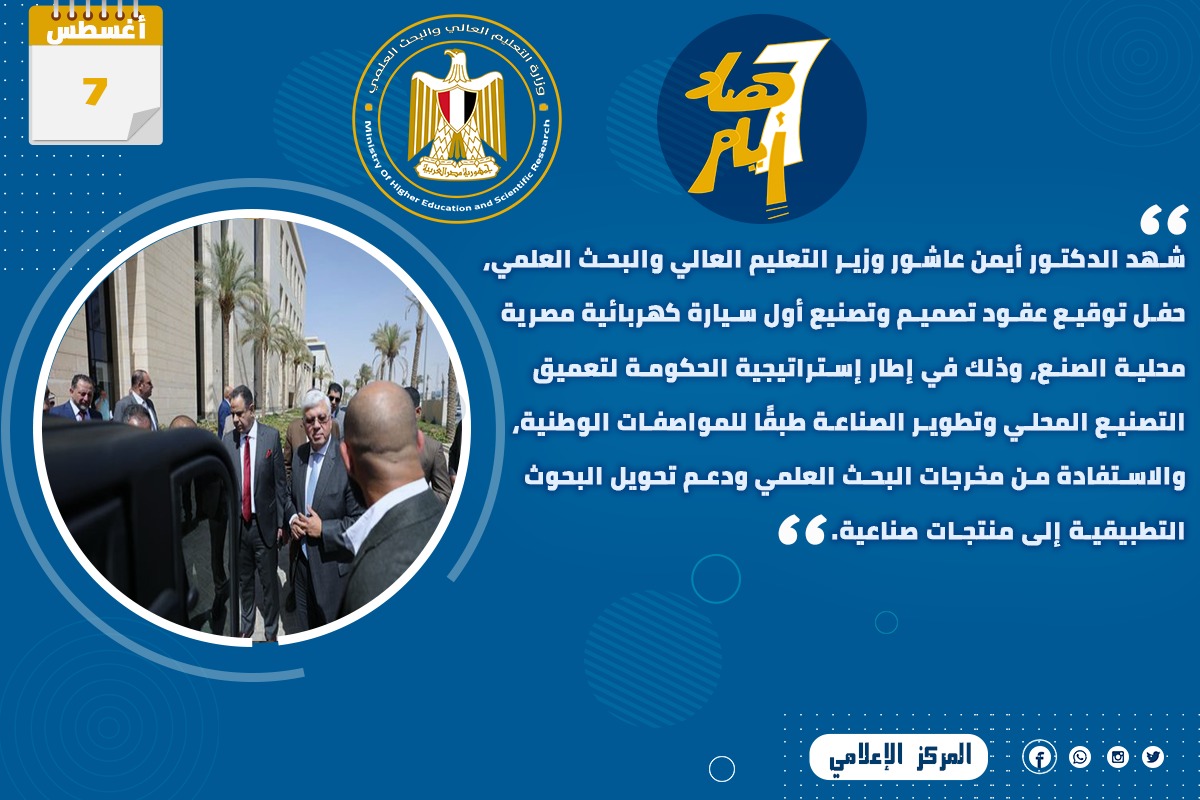 3) شهد الدكتور أيمن عاشور وزير التعليم العالي والبحث العلمي، حفل توقيع عقود تصميم وتصنيع أول سيارة كهربائية مصرية محلية الصنع، وذلك في إطار إستراتيجية الحكومة لتعميق التصنيع المحلي وتطوير الصناعة طبقًا للمواصفات الوطنية، والاستفادة من مخرجات البحث العلمي ودعم تحويل البحوث التطبيقية إلى منتجات صناعية.