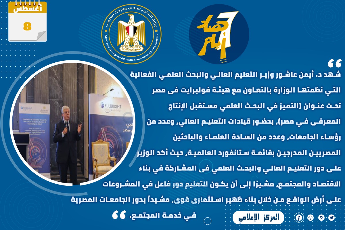 4) شهد د. أيمن عاشور وزير التعليم العالي والبحث العلمي الفعالية التي نظمتها الوزارة بالتعاون مع هيئة فولبرايت فى مصر تحت عنوان (التميز في البحث العلمي مستقبل الإنتاج المعرفي في مصر)، بحضور قيادات التعليم العالي، وعدد من رؤساء الجامعات، وعدد من العلماء والباحثين المصريين المدرجين بقائمة ستانفورد العالمية، حيث أكد الوزير على دور التعليم العالي والبحث العلمي فى المشاركة في بناء الاقتصاد والمجتمع، مشيرًا إلى أن يكون للتعليم دور فاعل في المشروعات على أرض الواقع من خلال بناء ظهير استثماري قوى، مشيدًا بدور الجامعات المصرية في خدمة المجتمع.