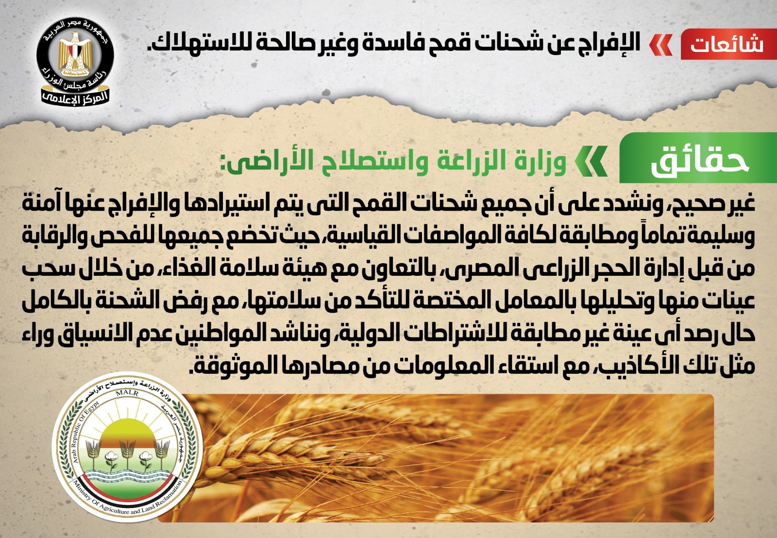 كشف المركز الإعلامي لـمجلس الوزراء أنه في ضوء ما تردد من أنباء تزعم الإفراج عن شحنات قمح فاسدة وغير صالحة للاستهلاك، تواصل المركز مع وزارة الزراعة واستصلاح الأراضي، والتي نفت تلك الأنباء، مُؤكدةً أنه لا صحة للإفراج عن شحنات قمح فاسدة أو غير صالحة للاستهلاك، مُشددةً على أن جميع شحنات القمح التي يتم استيرادها والإفراج عنها آمنة وسليمة تمامًا ومطابقة لكافة المواصفات القياسية، حيث تخضع جميعها للفحص والرقابة من قبل إدارة الحجر الزراعي المصري، بالتعاون مع هيئة سلامة الغذاء، من خلال سحب عينات منها وتحليلها بالمعامل المختصة للتأكد من سلامتها، مع رفض الشحنة بالكامل حال رصد أي عينة غير مطابقة للاشتراطات الدولية، مُناشدةً المواطنين عدم الانسياق وراء مثل تلك الأكاذيب، مع استقاء المعلومات من مصادرها الموثوقة.