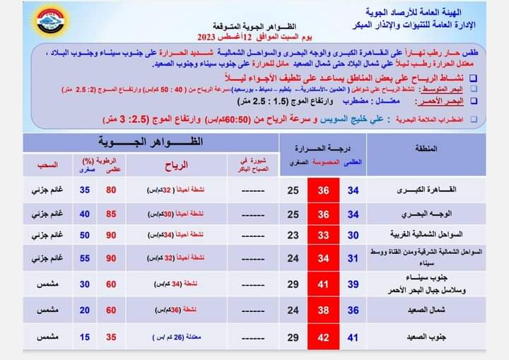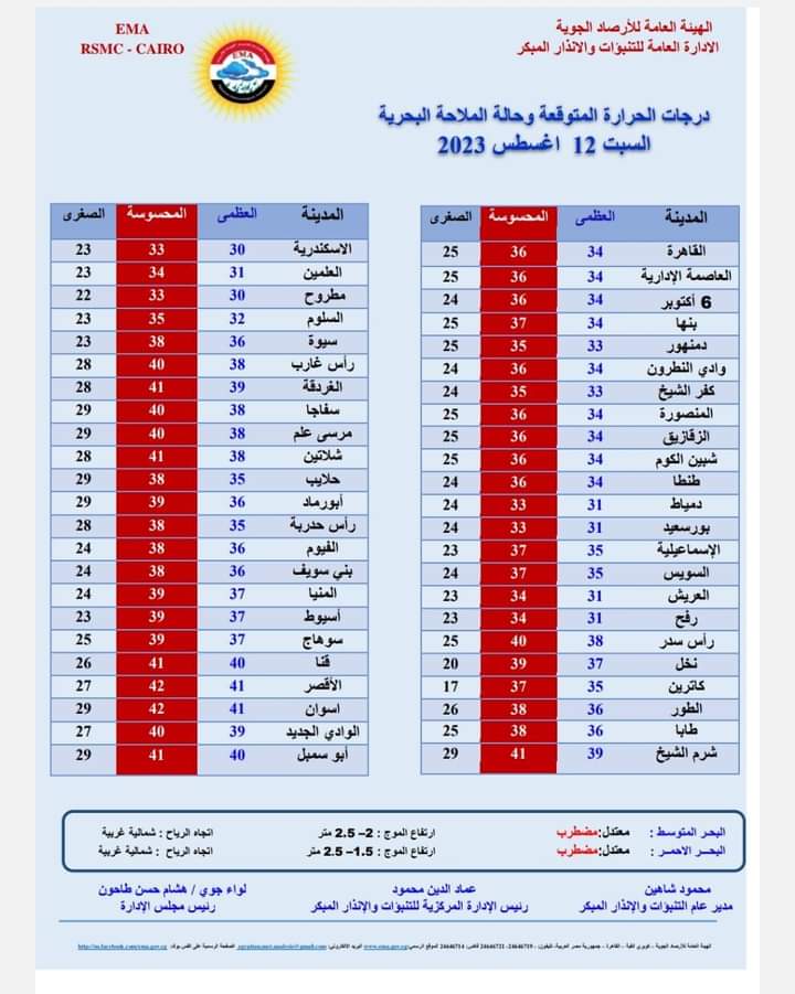 وأعلنت هيئة الأرصاد الجوية، حالة الطقس غدا السبت، حيث يسود طقس معتدل صباحا، حار رطب نهارا على القاهرة الكبرى والوجه البحري وشمال الصعيد، وعلى السواحل الشمالية، وشديد الحرارة على جنوب الصعيد.