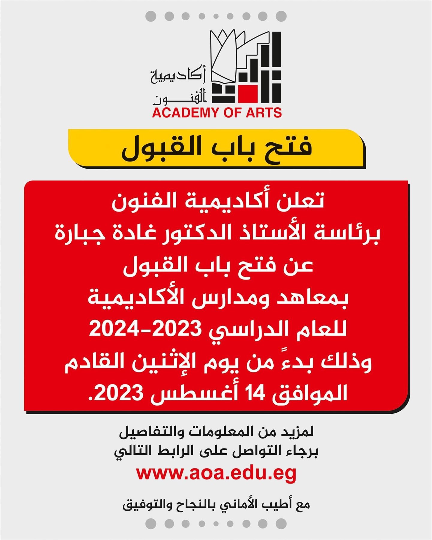 أعلنت أكاديمية الفنون برئاسة الدكتورة غادة جبارة، عن فتح باب القبول بمعاهد ومدارس الأكاديمية للعام الدراسي 2023 -2024 ابتداءً من يوم الاثنين المقبل الموافق ١٤ أغسطس ٢٠٢٣.