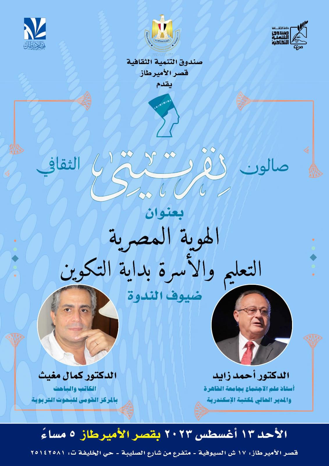 يستضيف قصر الأمير طاز التابع لقطاع صندوق التنمية الثقافية في الخامسة من مساء غد الأحد الموافق 13 أغسطس الجاري، أمسية جديدة من أمسيات "صالون نفرتيتي الثقافي"، حيث يقام هذا الشهر تحت عنوان "الهوية المصرية...التعليم والأسرة بداية التكوين".