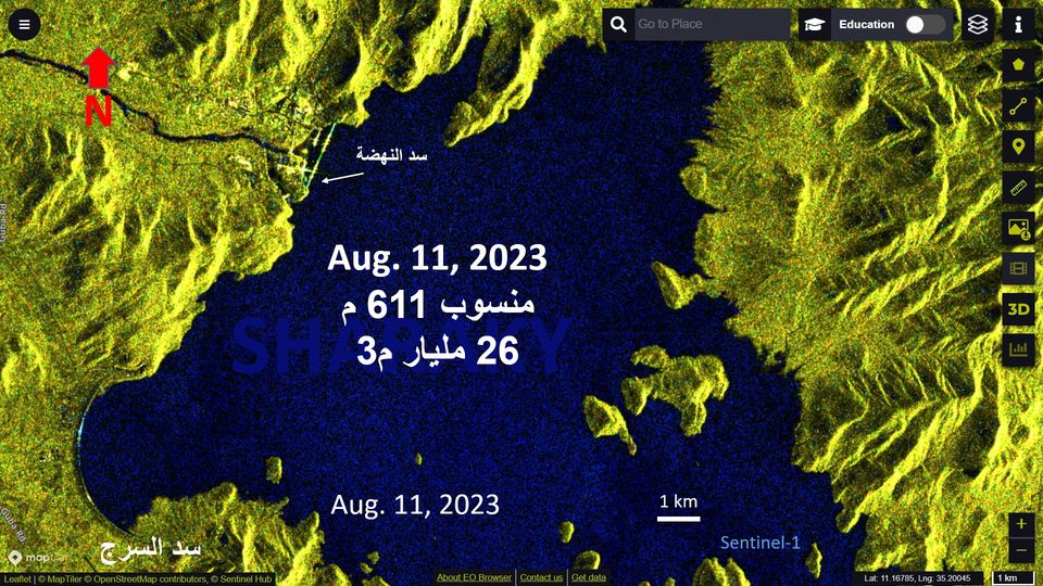 أوضح الدكتور عباس شراقي أستاذ الموارد المائية والجيولوجيا بجامعة القاهرة، أن منسوب بحيرة سد النهضة وصل إلى 611 مترًا فوق سطح البحر بعد تخزين 9 مليارات م3 خلال الأربعة أسابيع الماضية منذ 14 يوليو الماضي حتى الجمعة 11 أغسطس 2023، ليصبح إجمالي التخزين حوالي 26 مليار م3.
