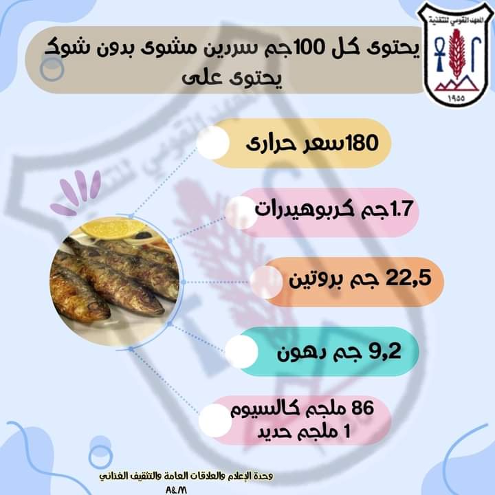 ونصح بتناول السردين نظرا لأن السردين يعتبر من مصادر البروتينات العالية القيمة الحيوية لاحتوائه على جميع الأحماض الأمينية الأساسية وله العديد من الفوائد منها: