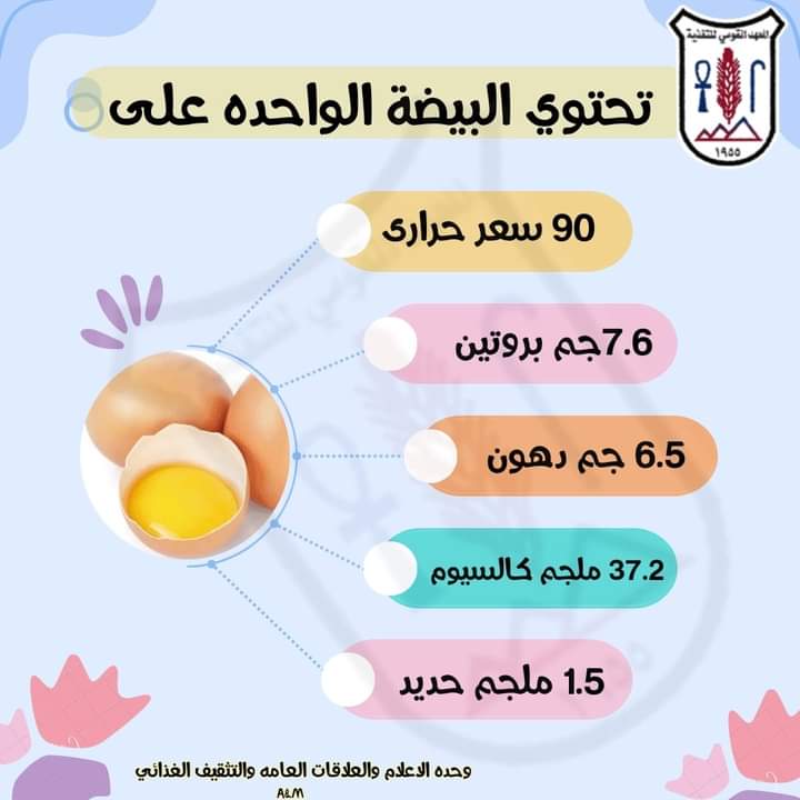 أوضح معهد التغذية أن البروتين الموجود فى البيض من البروتينات الحيوانية عالية القيمة الغذائية حيث أنه يحتوى على جميع الأحماض الأمينية الأساسية بالإضافة إلى إحتوائه على الحديد والكالسيوم ومادة الكولين التى تعمل على نقل الإشارات العصبية.