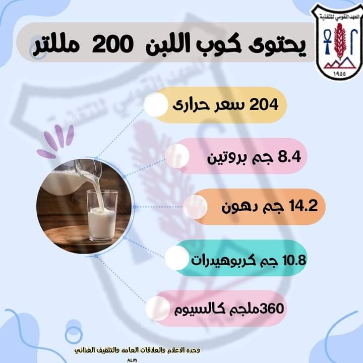 أكد المعهد القومي للتغذية أن كوب من اللبن يمد الجسم بحوالي ثلث احتياجاته اليومية من الكالسيوم، وأيضا يحتوى اللبن على الفيتامينات الذوابة فى الدهون " أ،د،ه،ك"