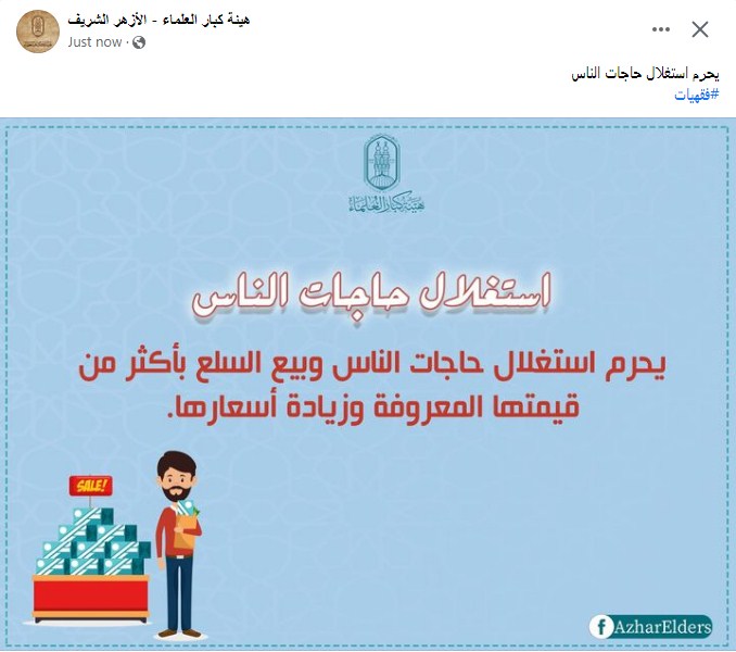 وعن حكم بيع السلع بأعلى من سعرها، كتبت هيئة كبار علماء الأزهر، تدوينة عبر صفحتها بالفيس بوك، محذرة "يحرم استغلال حاجات الناس وبيع السلع بأكثر من قيمتها المعروفة وزيادة أسعارها"